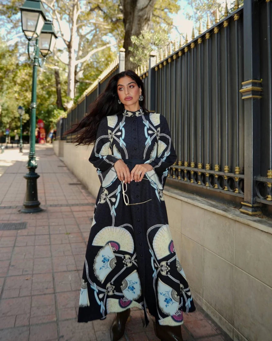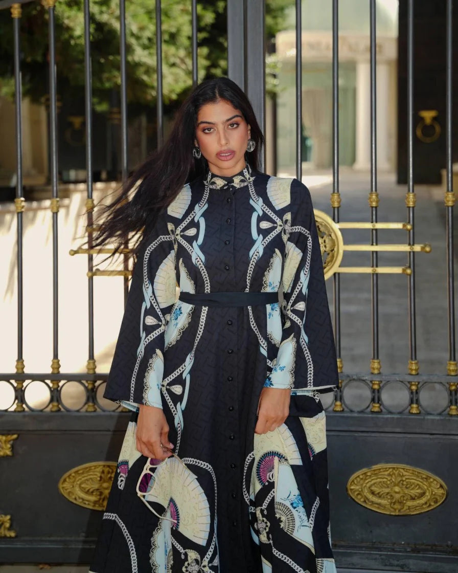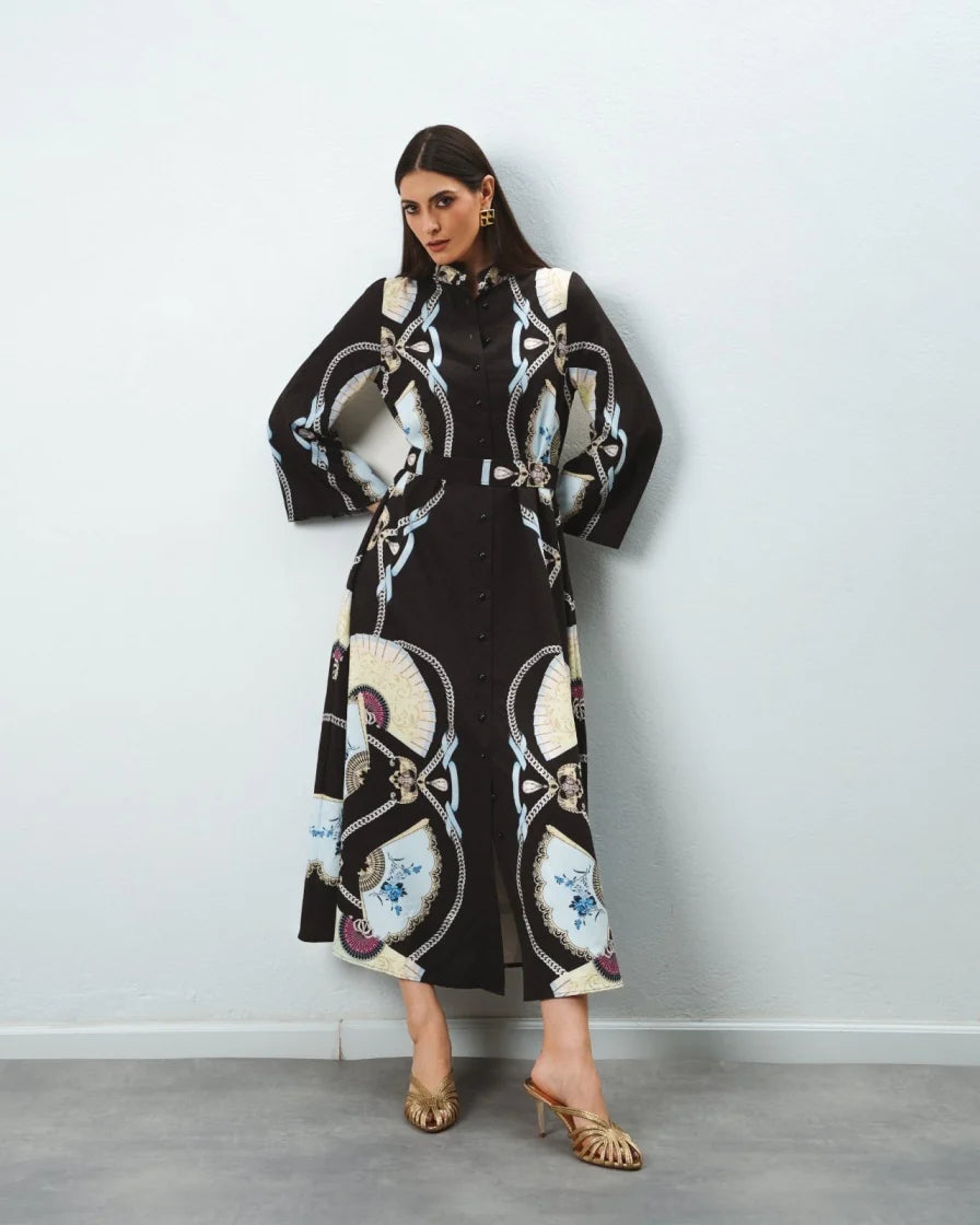 Το Blue Fan Dress ισορροπεί ανάμεσα στο κλασικό και το εκλεπτυσμένο με τη μαύρη βάση και το φωτεινό print σε γαλάζιες και απαλές κίτρινες αποχρώσεις. Η Α γραμμή και το δικό του ζωνάρι αναδεικνύουν τη σιλουέτα, ενώ ο mao γιακάς και τα φαρδιά μανίκια χαρίζουν μια πινελιά ανεπιτήδευτης κομψότητας σε κάθε κίνηση.